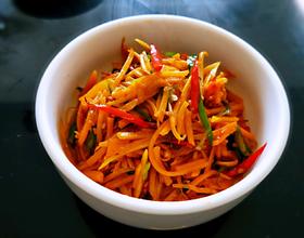 再倒入南瓜丝翻炒均匀。加入盐,五香粉,鸡精调味。