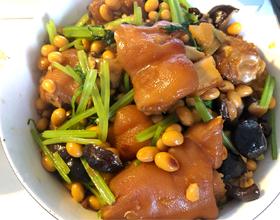 - 7. 翻炒均匀后,加入黄豆,加入适量水(没过猪蹄儿),倒入生抽,老抽
