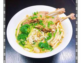 将鸭腿、海鲜菇放入碗中,浇上咖喱鸭肉汤,最后撒上一些葱花。一碗咖喱鸭肉面就做好了。