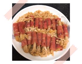 首先洗好金针菇,把尾部切点少许,培根一条切三段,然后卷好用牙签固定。我是两个两个的卷起来用牙签固定的。