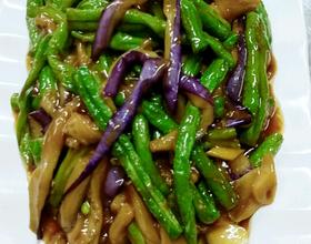 - 1. 茄子切成长条,豆角改刀切长段,姜片蒜片打出备用