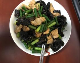 热锅凉油,油温3成热时,放入五花肉翻炒,油温8成热时,放入蒜苔,木耳,翻炒。