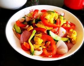 无论是洋葱,甜椒,黄瓜都是易熟的食材。快速翻炒均匀就可以依次倒入下一个食材,不需要炒太长时间。这道菜有甜椒和洋葱的甜味,吃起来有水果味。