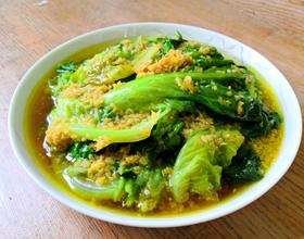 蒜蓉汤汁翻滚之后,将汤汁均匀的淋在汤好的生菜上面即可。