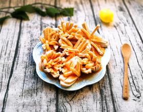 - 3. 用两根筷子把杏鲍菇夹起来切,先横切再竖切,尽量切得深一些,切成花朵的形状 。
