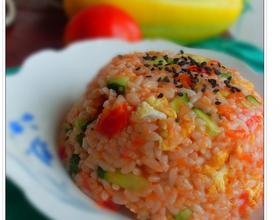 下入米饭翻炒,使每一粒米饭上都包裹番茄汁,放入鸡蛋和黄瓜丁即可。