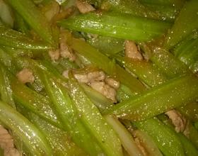 第四步:热锅倒入油.在放入点葱姜丝爆香放入肉丝翻炒变色.放入西芹继续翻炒几下.再少放一点盐.胡椒粉.味精炒好出锅转盘即可食用!