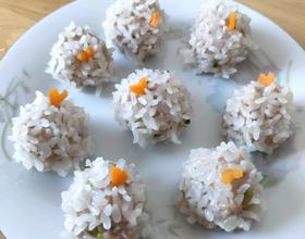 - 3. 做珍珠丸子,将馅料搓成小团,放到糯米中滚,我个人觉得糯米不需要完全滤干水,把泡糯米的水倒掉就行了,小团在糯米中滚一滚。