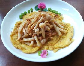 摆盘,蛋饼铺底,放上白玉菇,用铜钱草叶子,紫薇花和荷叶杆做装饰即可。