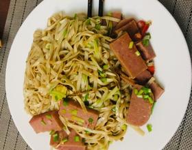 - 5. 午餐肉有一点焦焦的时候放入面条,(如果要加豆芽的在这个时候加)再加海椒沾水(辣椒酱)翻炒均匀,最后撒上葱花就大功告成了!