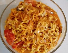 - 14. 把酱料包放进去(连同海苔碎),煮30-60秒,汤汁收的差不多就可以了