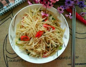 - 6. 配料煸香后,倒入土豆丝翻炒