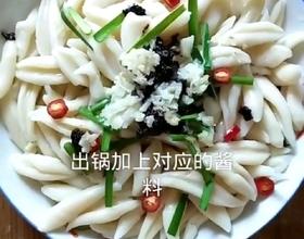 面熟出锅成盘,放上切好的,红椒,韭菜,牛肉酱,蒜泥,香油,盐,醋。拌均匀即可。