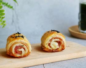 快卷到头的时候,把培根剪去一点,使饼与饼直接黏连在一起