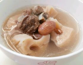 另起汤锅,倒入排骨莲藕花生,一次性加入足够的水
