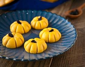 - 4. 将面团分成一个个小面团,搓成圆形,用牙签在面团上按出类似南瓜的纹路出来,将蔓越莓干切成细条状,插在南瓜顶作为南瓜梗,将造好形的南瓜放入蒸锅,大火蒸20分钟即可食用