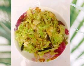 把调好的汁和煸好的葱姜蒜一块倒入包菜中,拌匀