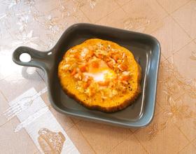 南瓜圈四周摆放炒好的洋葱火腿炒饭