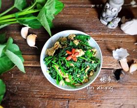 苕叶炒至8分熟时倒入鸡蛋,苕叶下锅后最好在1分钟左右出锅,这样营养成分不流失。口感也很好。