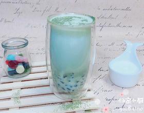 再向杯中倒入抹茶水,顶部弹上一些抹茶粉。