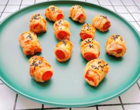 将解冻好的手抓饼用刀划成六等份,每根火腿肠切成四份,鸡蛋取蛋黄备用
