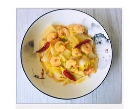 锅中放油,葱爆锅,放入虾仁翻炒。