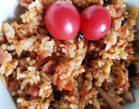 把胡萝卜丁和肉丁以及米饭放入锅中翻炒