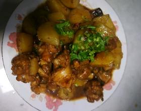 放入葱姜蒜末,炒香后放入土豆块和香菇块。放入酱油,五香粉,炒香。
