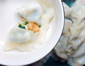放馅,每个馅儿里放1-2个虾仁(我用的是现成的饺子皮,如果觉的饺子皮干,可以在皮的周围涂一些水,这样就容易包上了)