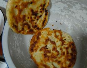 - 7. 锅中倒油,不用太多一层覆盖锅底就好,待油热了,把饼坯子放进去,盖上锅盖小火慢烙,待听到滋的一声的时候,打开锅盖翻过来,在同样的方法烙一下。