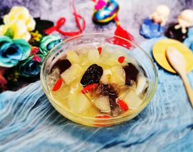 红枣银耳汤煮30分钟后,加入泡过水的百合和雪梨块,煮10分钟。