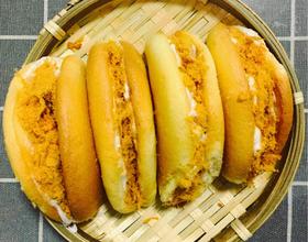 - 15. 蛋糕饼背面轻轻划一刀,另一面涂抹淡奶油后撒上肉松