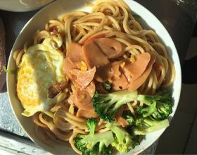 放菜菜们炒一下,放胡椒酱,放番茄沙司翻炒3分钟,然后放意面放盐巴,翻炒2分钟出锅。