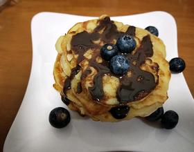 最后淋上巧克力酱或蜜糖,放一些水果点缀,完成