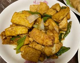 加入煎至金黄的豆腐同炒,然后加入生抽