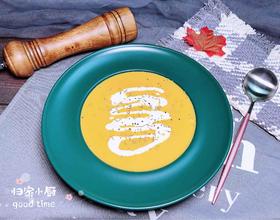 将香浓的南瓜玉米浓汤盛入盘中。