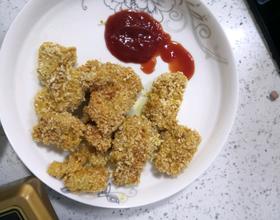 油烧热 先蘸面粉再蘸鸡蛋液再蘸面包糠放油炸至两面金黄