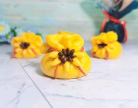 - 5. 剩余的南瓜面团揉面排气,分成每个35克的剂子搓圆,擀成包子皮。再准备15克/个的白芸豆馅。