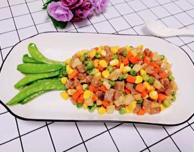 再倒入胡萝卜丁、青豆、玉米粒翻炒片刻