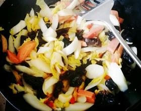 - 6. 再把焯好的白菜若干放入锅中翻炒,添加盐,五香粉酱油等调料。