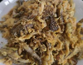 腌好后,锅中烧油,油温6成热放入腌好的蘑菇