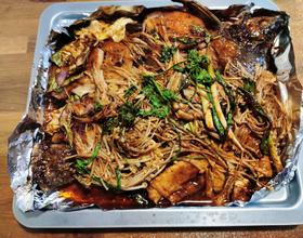 取比烤盘稍大的锡纸四周折起成碗的形状(这样汤汁不容易滴入烤盘好清洗)刷一层油,放在烤盘里把腌好的鱼涂上酱料放入(用了一半的鱼,烤盘有点小,鱼买大了)