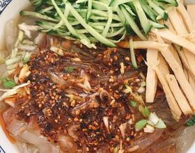 - 7. 把粉皮捞出放进碗中,把黄瓜丝,豆腐干丝和调料汁根据个人口味放进去,爱吃辣的放辣椒油拌匀就可以开动啦!