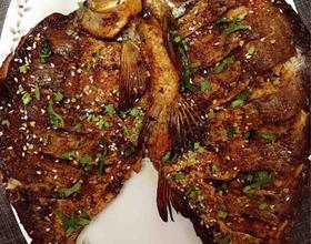 - 1. 鱼洗净,从腹部切开,背部相连,今天是家人洗的,把鱼背部切开,腹部相连,都是可以的,只要保证能平放在烤盘上,之后鱼里外都抹点盐。再准备一个小碗,里面放入生抽,少许老抽,耗油,孜然粉,黑胡椒粉,少许糖,搅拌一下,蒜和姜用东西搅碎,把上面所有调料和蒜姜泥一起往鱼身上抹,给它按摩五分钟,然后腌半个小时。