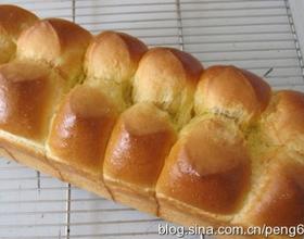 - 5. 发酵到模具的八分满,表面刷蛋液,用剪刀在中间剪一道,中间挤上一条奶油