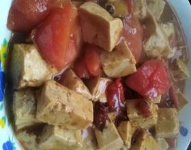 在倒入豆腐,用水把老抽咸盐化开倒入锅中。等水开后,稍微翻炒,注意别把豆腐碰碎了。