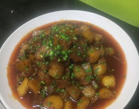土豆倒入炒锅内,再把压熟的肉墩带汤倒入锅中开大火收汁至汤汁浓稠或快干时关火起锅装入盘中撒葱花即可