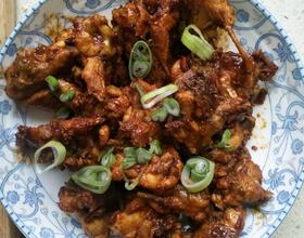 出锅后撒上葱花,美味的辣炒鸡叉骨就可以吃了