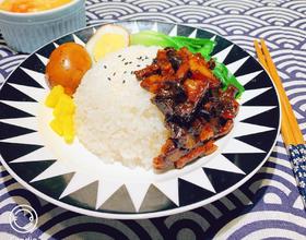 到四五十分钟时看下锅,汁差不多时开锅盖煮二三分钟收汁。米饭装盘,青菜,切好的卤蛋,浇上卤肉,放一点寿司萝卜小菜配色,完成。