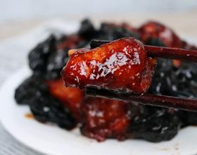 - 6. 加入一杯水,不用没过排骨,再加入西梅,25g醋,盖上锅盖焖一会儿,直到汤汁收干即可